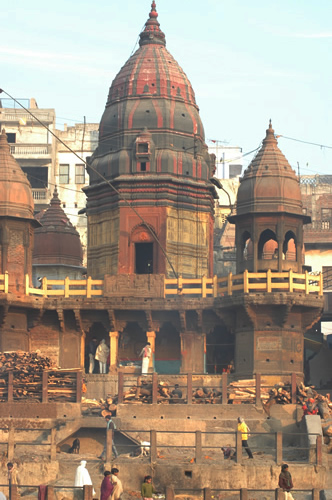 Less than half a mile away from the temple structure lies another famous Hindu location, the Manikarnika Ghat. A “ghat” is literally a flight of steps that descends down to a body of water. One of many ghats in the city, the Manikarnika Ghat, located along the Ganges river, is known for being a site of cremation. It is believed that Vishnu, the Hindu god of preservation, was the builder of this particular ghat.